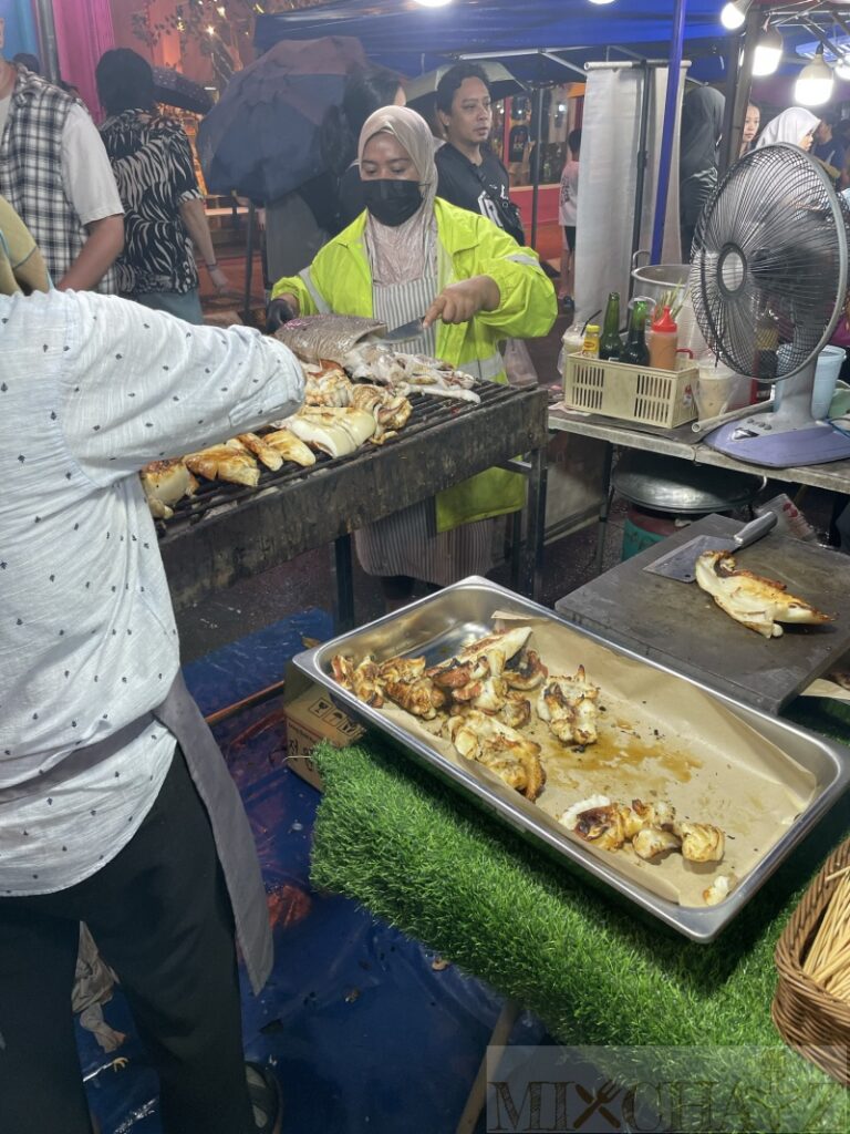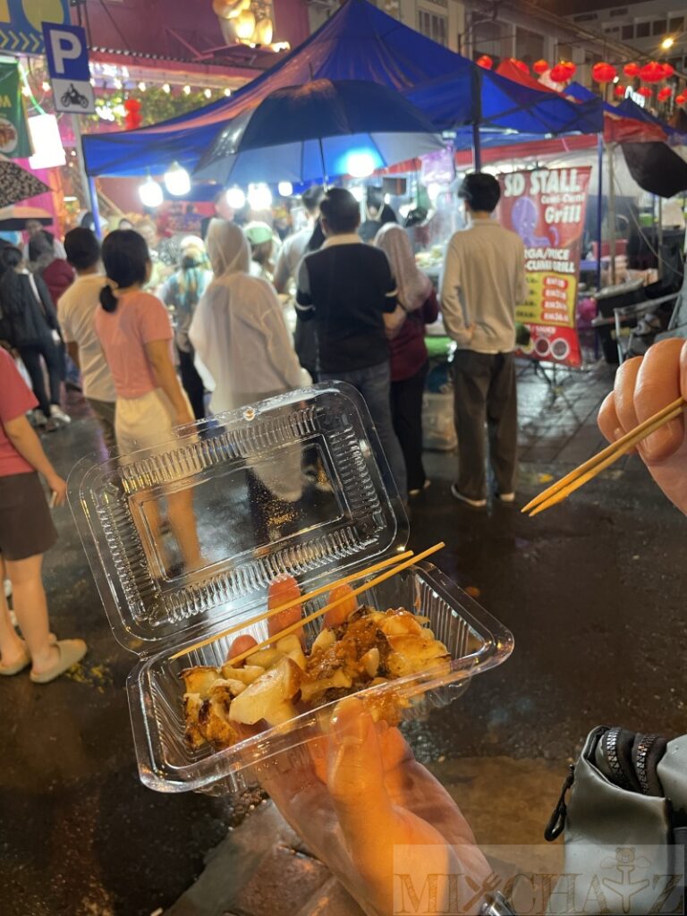 先喺夜市門口買咗燒魷魚,都幾多人排隊,啲魷魚幾厚肉彈牙,佢嘅醬汁幾好味,雖然對我哋嚟講有啲太辣。